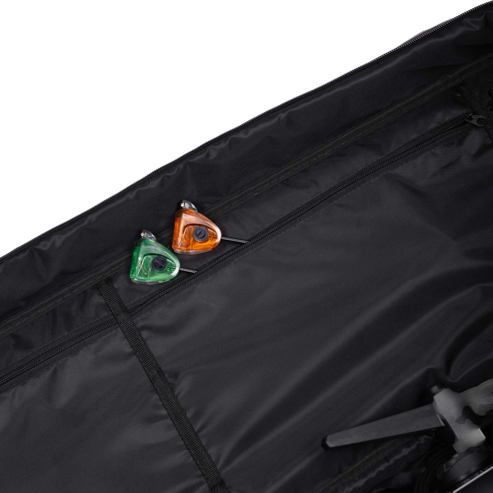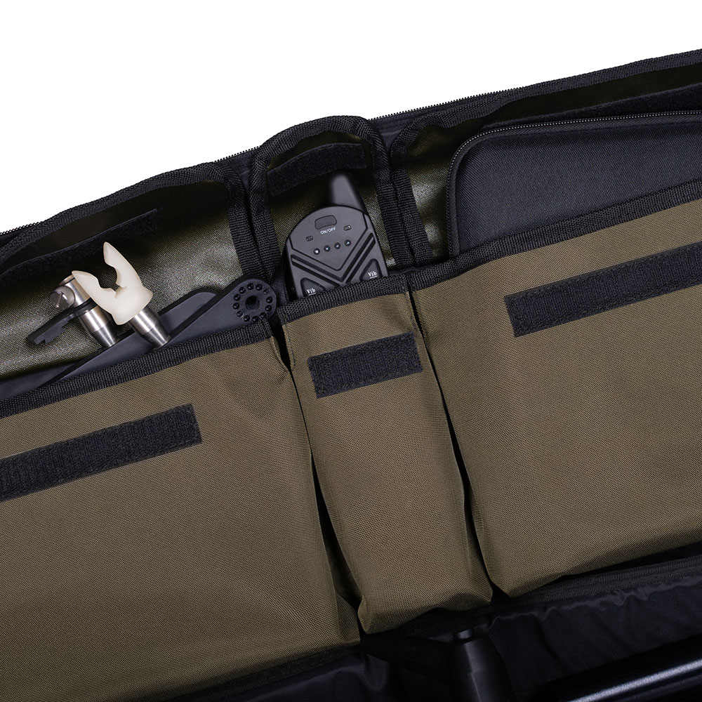 Внутрішні кишені: Сумка з середини оснащена трьом кишенями на змійці які ідеально підходять для зберігання свінгерів або інших дрібних аксесуарів, двома великими кишенями на липучці для зберігання буз-барів з сигналізаторами клювання, та має універсальну кишеню на липучці для вашого пейджера.