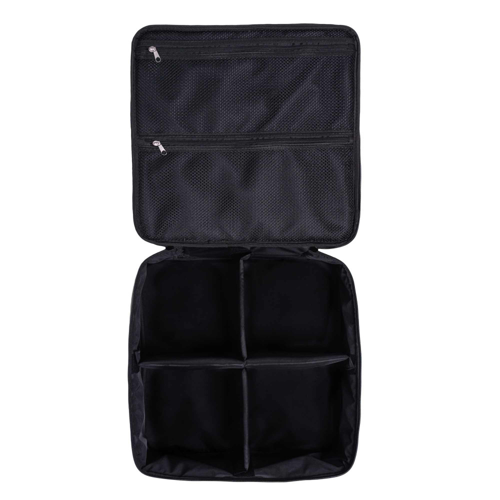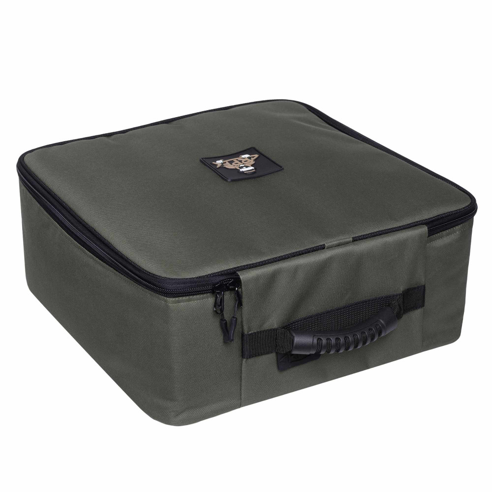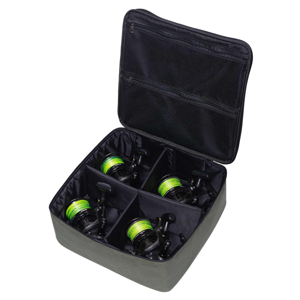 Сумка-кейс для чотирьох великих котушок розміром 14000 . Виготовлена з надміцного вологостійкого матеріалу оксфорд. Жорсткий каркас і м'які вставки в середині надійно захищають котушки від пошкоджень під час транспортування. В середині є кишеня з сітки на блискавці для дрібних аксесуарів. Збоку є ручка для перенесення.