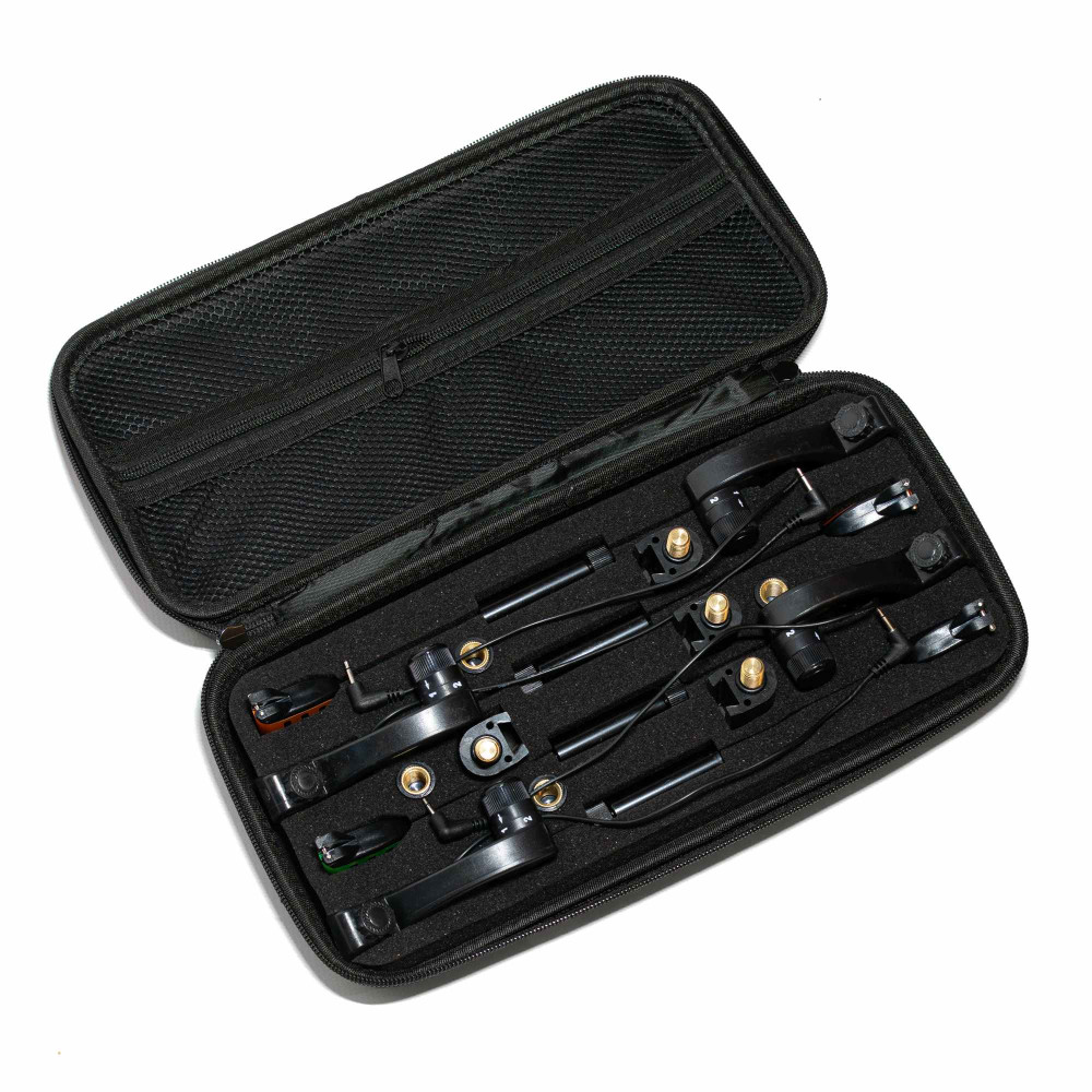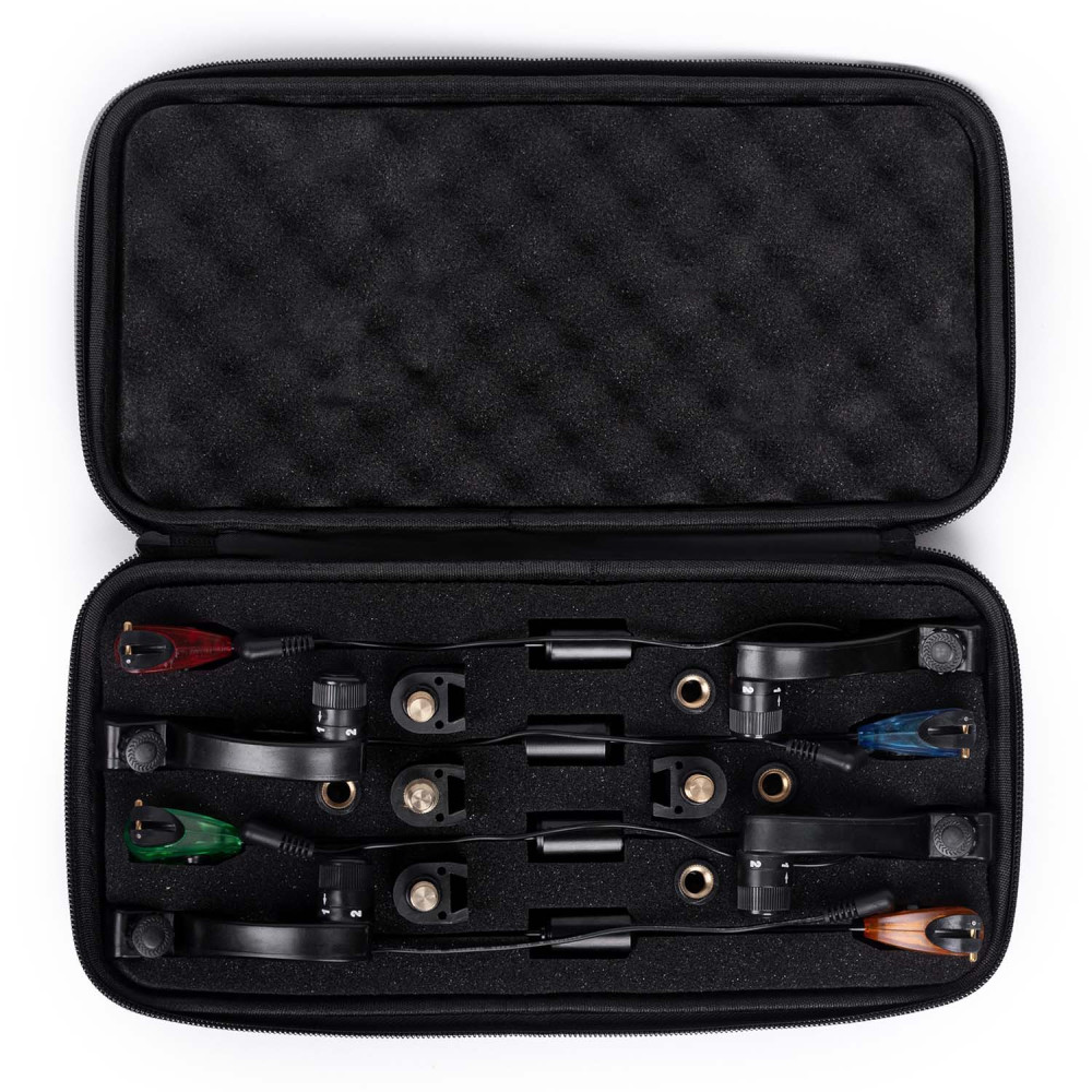 - Комплект дуже чутливих механічних сигналізаторів клювання для коропового лову, обладнаних швидкознімними конекторами для кріплення до род-поду, та додатковими швидкознімниками для сигналізаторів